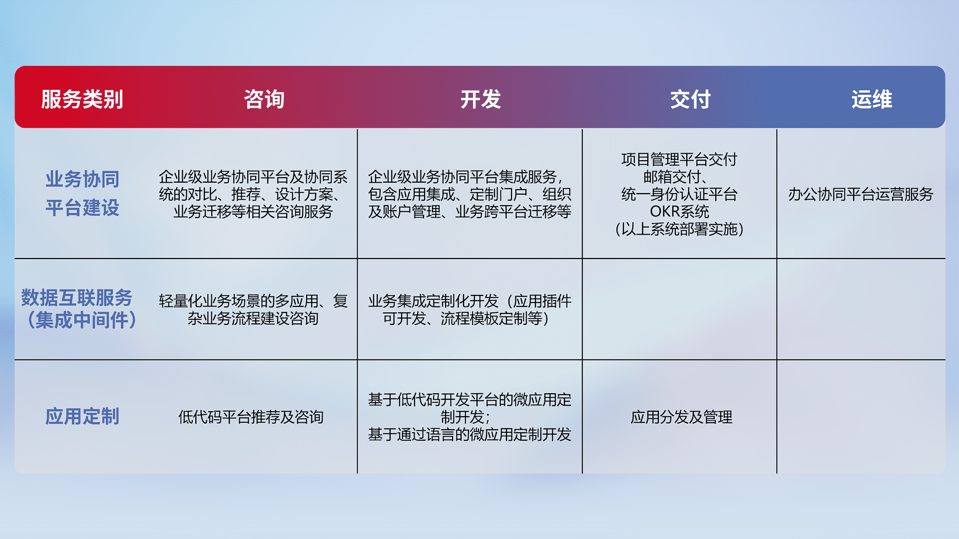 针对钉钉、、企微、、、IDaas等平台级产品提供产品的规划、、、、方案、、交付、、、定制化开发等服务,,,,实现如统一协同办公、、、、智能客户服务、、、混合会议管理、、、智能数据查询、、等业务场景,,实现数字化转型。。。。